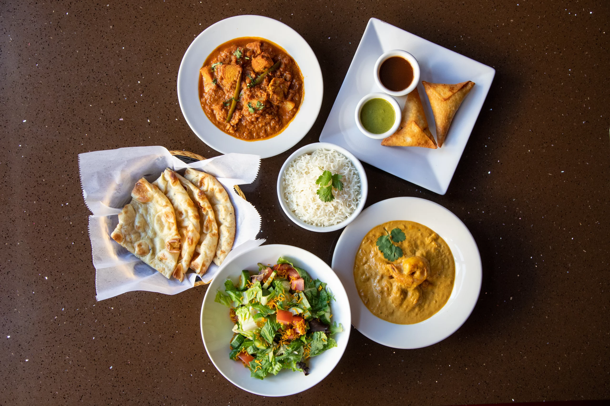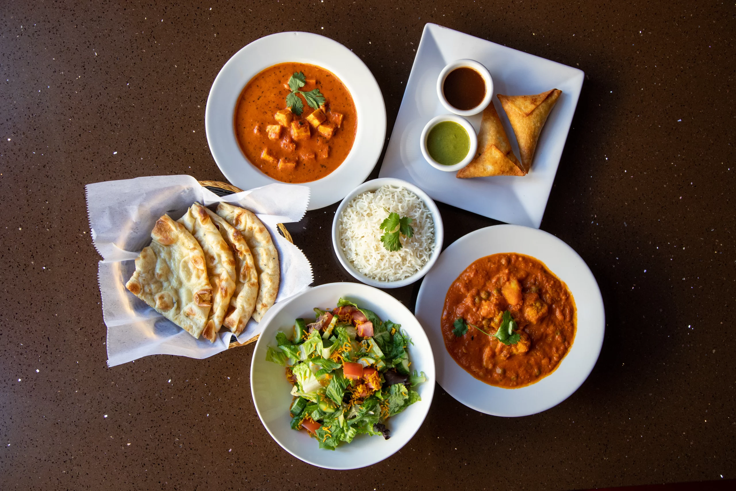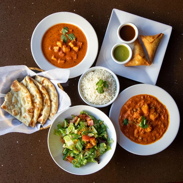 Some of our most loved dishes include Butter Chicken, Chicken Tikka Masala, Vegetarian Korma, Shahi Paneer, Saag, Tandoori Chicken, Chicken Tikka, Samosa, and Garlic Naan.